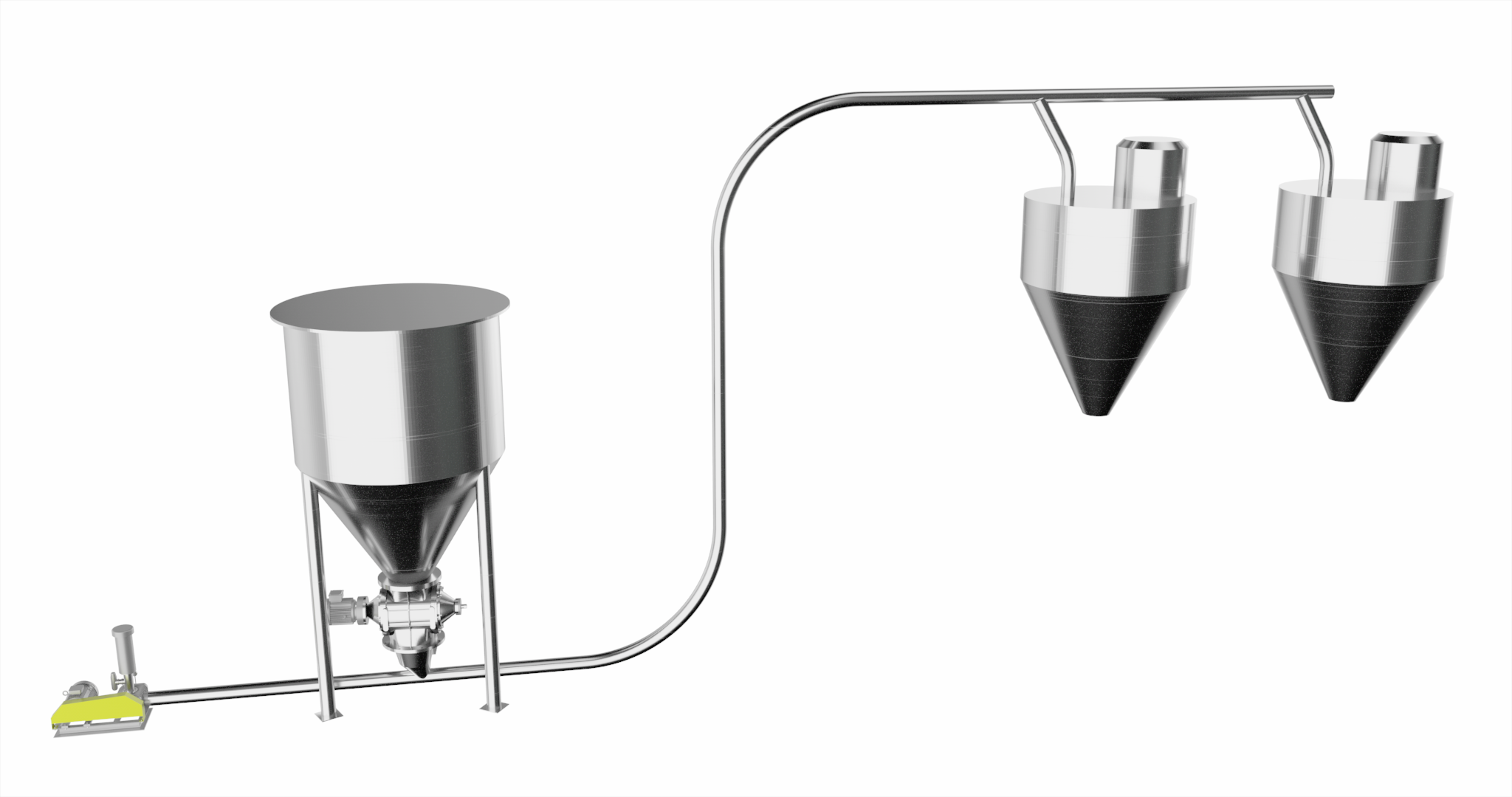產(chǎn)品介紹:正壓輸送系統(tǒng)區(qū)別負(fù)壓輸送,適于分散輸送,即一點(diǎn)向多點(diǎn)輸送,在輸送管線中,物料可在任意卸料點(diǎn)依靠物料的重力與輸送介質(zhì)實(shí)現(xiàn)分離。一般工業(yè)化學(xué)行業(yè),新能源行業(yè)使用此種輸送方式較多。一般輸送壓力動(dòng)力在輸送物料前端,將物料押送至目標(biāo)料管后,料管上設(shè)有排氣裝置,用于氣體和物料分離。輸送特點(diǎn):1、適用于從一處向數(shù)處的分散輸送2、因?yàn)檩斔拖到y(tǒng)為正壓,所以在系統(tǒng)的組成部分中連接處即使有縫隙,大氣或雨水也